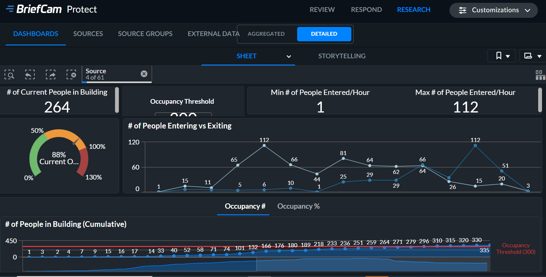 With BriefCam, campuses can use video analytics to understand movement and occupancy over time. Using the Research module, teams analyze trends such as entry and exit activity, dwell time and peak usage across buildings and zones.
